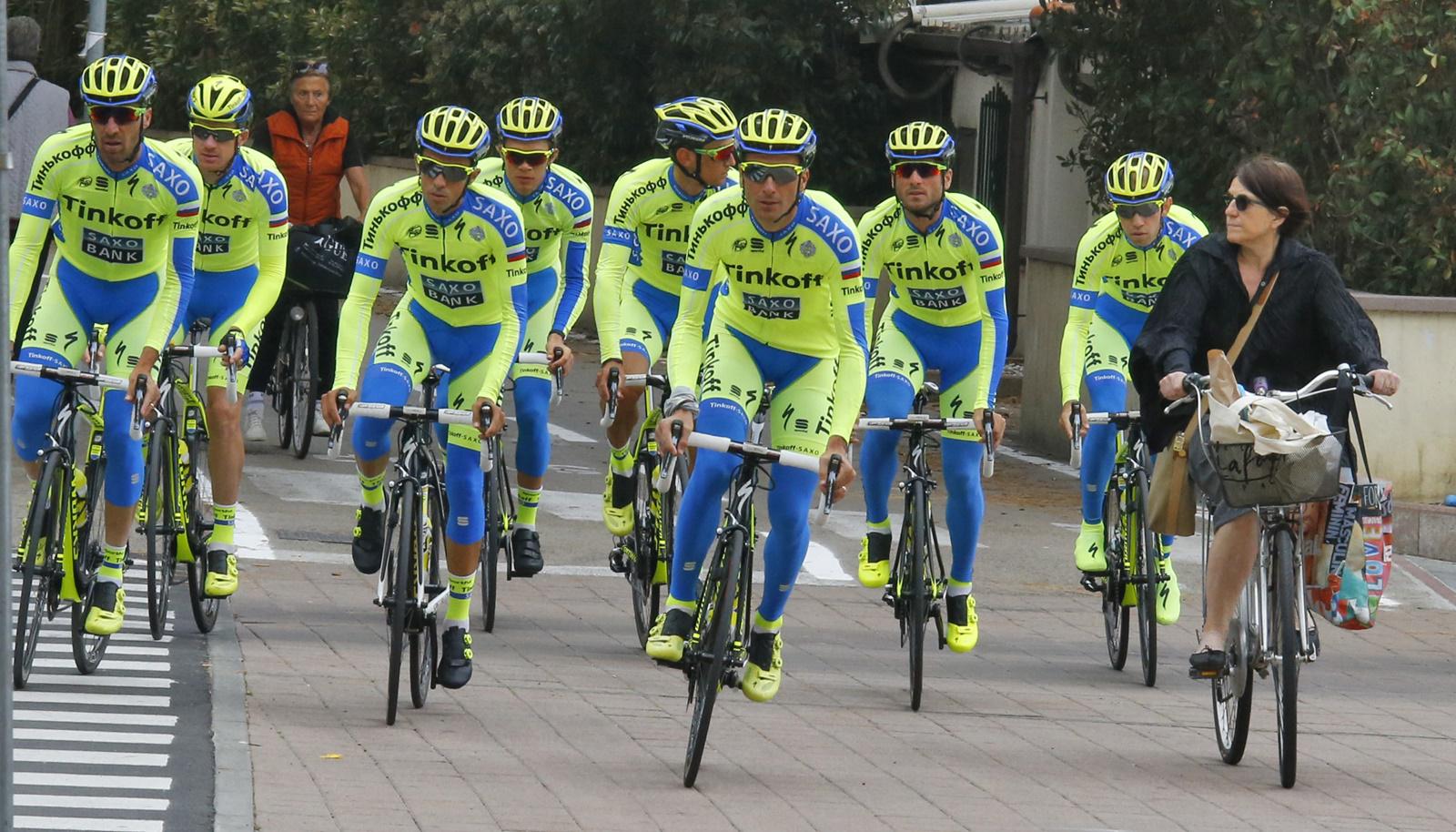 The Latest: finally, I'd be wholly remiss if I didn't remind my loyal reader(s) that: (1) Reigning Tinkoff-Saxo megalomaniac Oleg Tinkov says if Alberto Contador doesn't win this thing in his sleep, he's a hopeless weakling weenie; (2) he'd win it himself if his damn knee hadn't been bothering him, but it's still strong enough to kick Berto's butt off Aprica if he don't save Oleg's ego; (3) no less a cycling god than Bernard Hinault says Alberto can do the Giro-Tour double, so no pressure if you prove *him* wrong; and (3) Tinkoff-Saxo have, in addition to a video of comely two-time champ Ivan Basso's plan for victory, released this *hugely* intimidating photograph of an intently-focused Giro squad absolultey *smoking* a woman riding home with her groceries. Beat *that*, Aru you poser pretender wannabe!